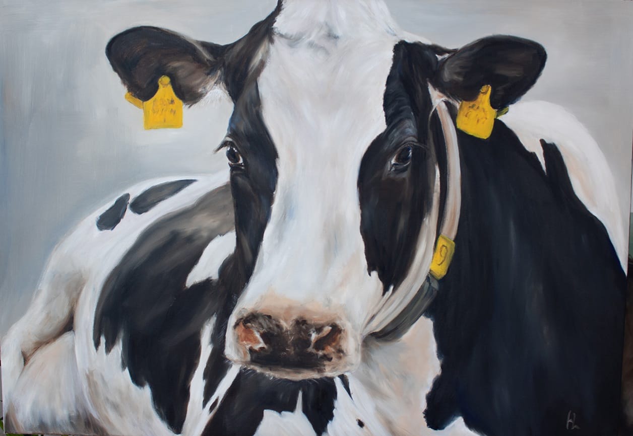 De liggende koe is gemaakt van olieverf op een katoenen doek van 100×70 cm (zijkanten zijn zwart mee geschilderd, waardoor het e.v.t. zonder lijst kan worden opgehangen)